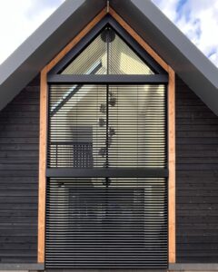 Deze woning in Veldhoven kenmerkt zich door bijzondere kozijnvormen, waaronder schuine en standaard raamvlakken. Voor optimale zonwering realiseerde LivingLux een combinatie van schuine buitenjaloezieën en rechte systemen.